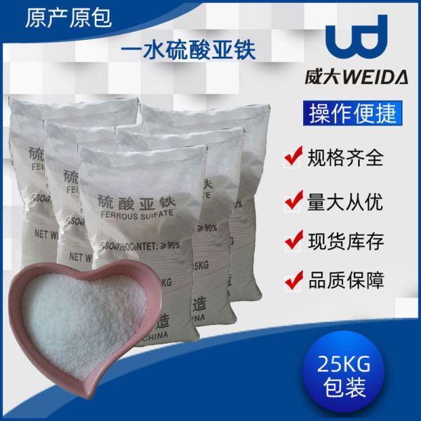 一水硫酸亞鐵粉末為灰白色,無臭,味咸。在水和甘油中易溶,不溶于乙醇,具有腐蝕性,潮解風化。就其用途而言,一水硫酸亞鐵一般用于工業和農業,也可用于醫藥。一水硫酸亞鐵可作農業殺蟲劑,可防治小麥黑穗病、蘋果、梨及果樹腐爛等病害。補充畜禽對亞鐵營養的需要,可作為飼料中鐵的補充劑,防治缺鐵性貧血及其并發癥。